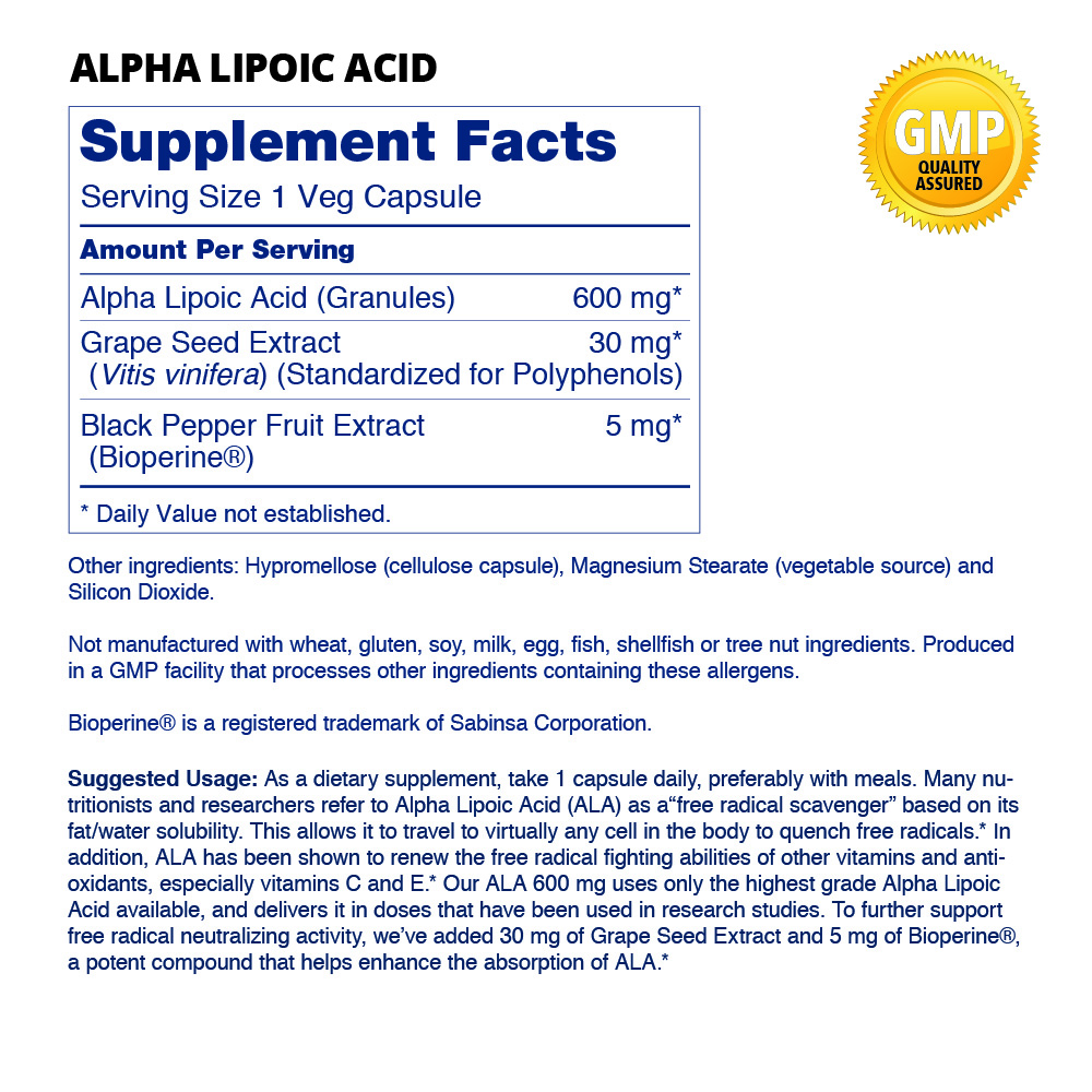 Suggested Usage: As a dietary supplement, take 1 capsule daily, preferably with meals, or as directed by your healthcare provider. Many nutritionists and researchers refer to Alpha Lipoic Acid (ALA) as a“free radical scavenger” based on its fat/water solubility. This allows it to travel to virtually any cell in the body to quench free radicals.* In addition, ALA has been shown to renew the free radical fighting abilities of other vitamins and antioxidants, especially vitamins C and E.* Our ALA 600 mg uses only the highest grade Alpha Lipoic Acid available, and delivers it in doses that have been used in research studies. To further support free radical neutralizing activity, we’ve added 30 mg of Grape Seed Extract and 5 mg of Bioperine®, a potent compound that helps enhance the absorption of ALA.*