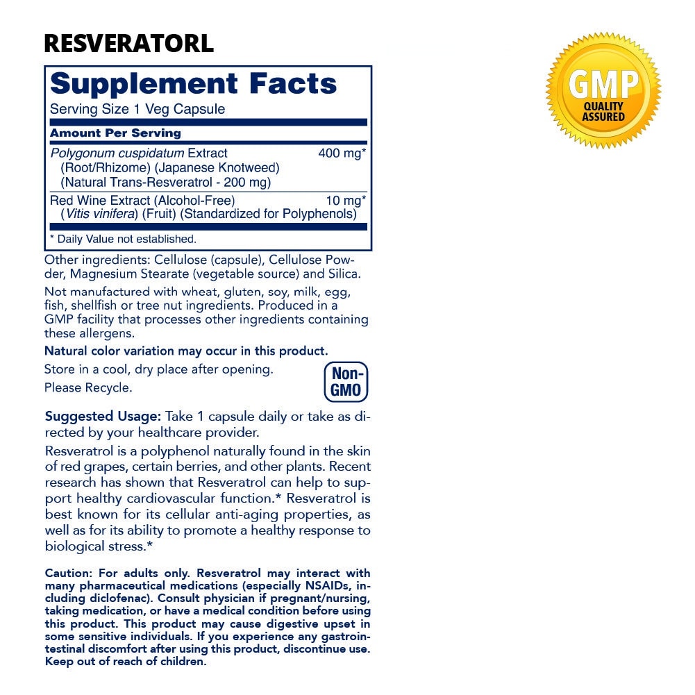 The Center for Nutrition’s Natural Resveratrol 200 mg contains the equivalent amount of Resveratrol that would by found in about 10 liters of organically produced red wine. It contains 200 mg of Natural Trans-Resveratrol. And 10 mg of Red Wine Extract (Alcohol-Free) with a minimum 30% Polyphenols.