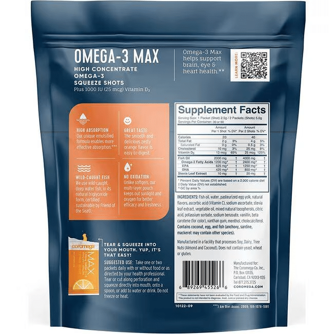 Coromega is not a pill! Omega 3 Squeeze is a tasty burst of goodness with two essential fatty acids from a highly purified fish oil, DHA and EPA, and a clinically proven 300% better absorption than regular fish oil softgels.