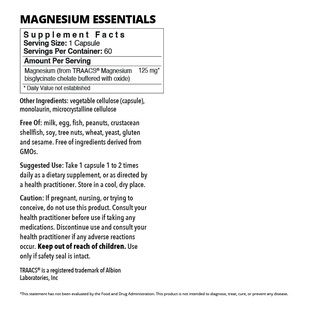 Magnesium Essentials is a highly absorbable form of magnesium known as magnesium bisglycinate and is designed to maximize absorption and minimize any GI side effects, i.e. laxative effect.