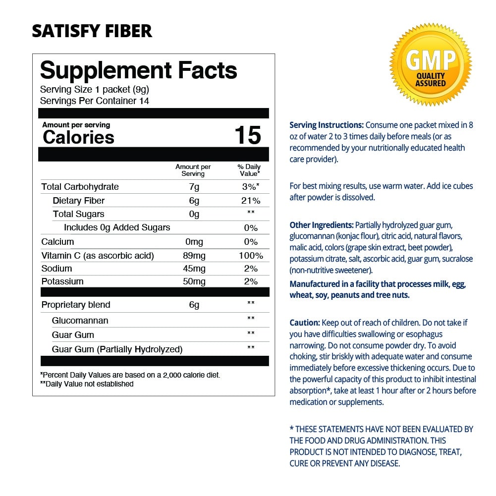 Mix the content of one Dr. Tague’s Satisfy Fiber packet in at least 8 oz of water (or your favorite sparkling beverage), drinking before gel-forming is complete. Consume 1 packet 15-60 minutes before the largest meals of the day for best results. Use 1 to 3 packets daily.